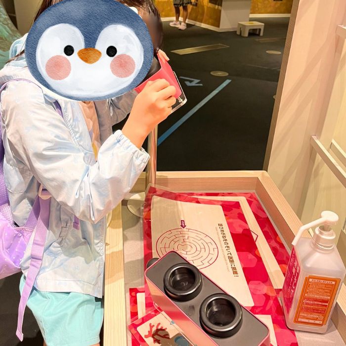 ▼逆さメガネなど子供たちがやってみたい!おもしろい!という展示が沢山あります。逆さメガネで迷路を逆に見てゴールを目指しますがメガネを覗き込みながら、指で迷路をたどろうとすると結構難しいと言っていました😊