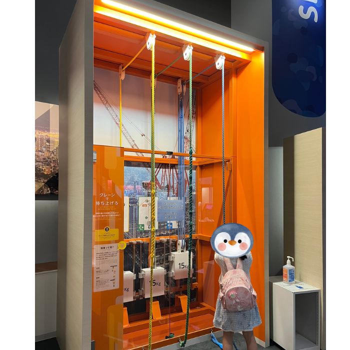 15キロの重りをそれぞれ1本のロープ、滑車で引っ張った重さなどの違いを体感できます。